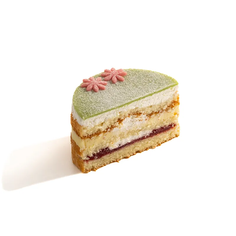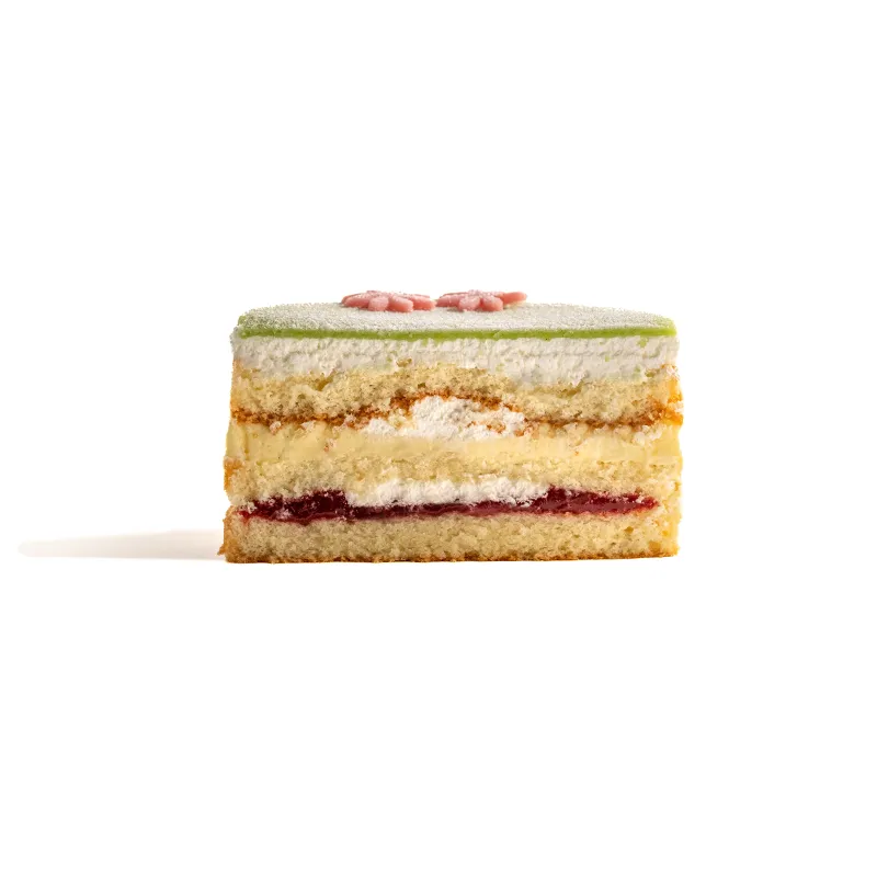 مناسب برای 5 تا 6 نفر. قطر حدودأ 15 سانتی متر.لایههای کیک سبک ژنواز که در بین آن با کرم پتیسیر، خامه سبک شده و مارمالاد توتفرنگی پر شده و با مارزیپان خانگی سبز رنگ تزئین میشود.