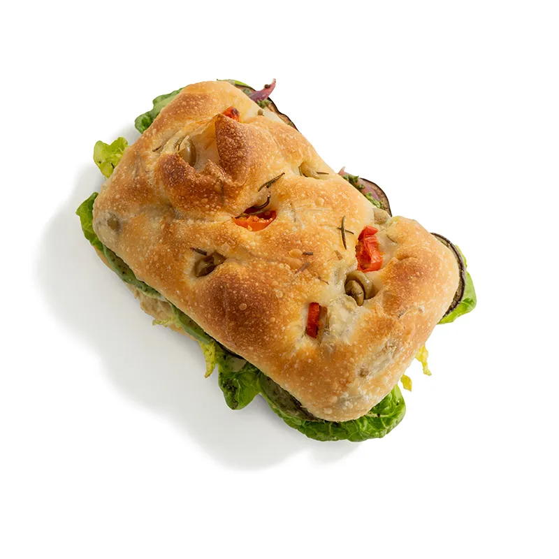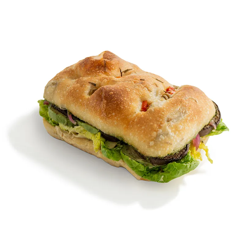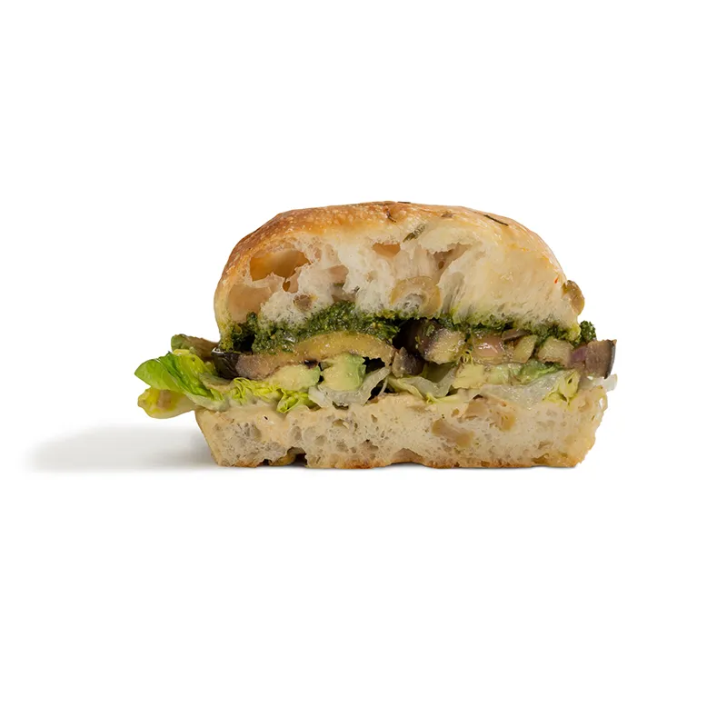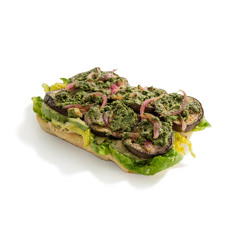 مناسب یک نفر شامل: بادمجان، آووکادو، خمیر نان فوکاچیا، گوجه، کاهو فرانسوی، حمص، پیکل پیاز قرمز و سس پستو آرگو