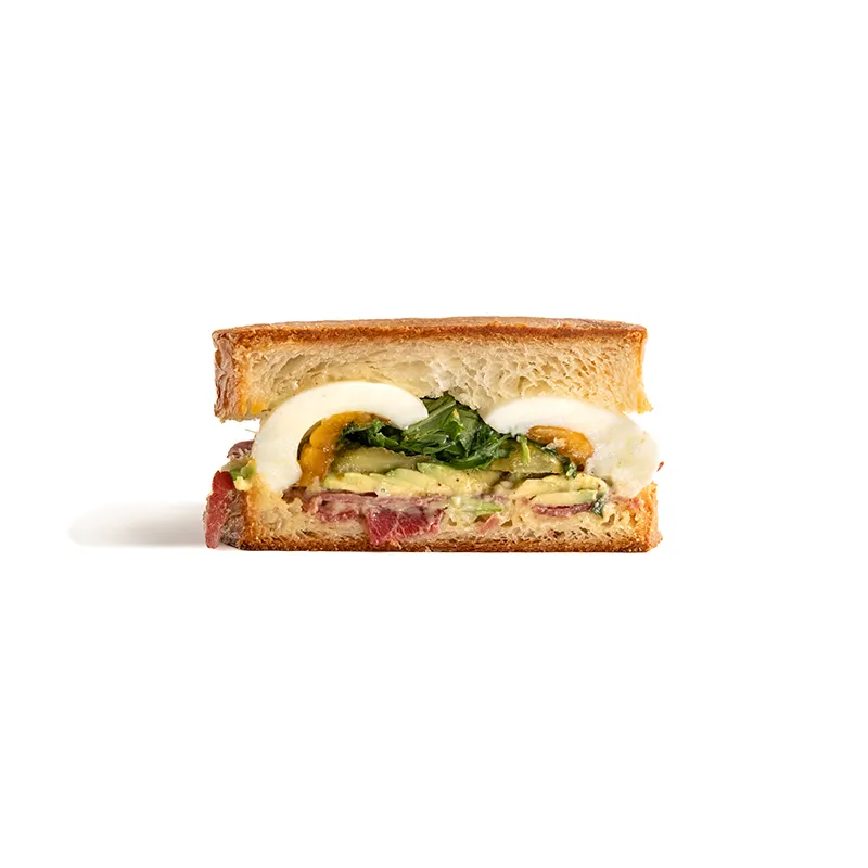 مناسب برای یک نفر، متشکل از: نان لوف مولتی گرین، تخم مرغ، سس آووکادو و ماست، میکرو گرین ترب، تخم کدو ...