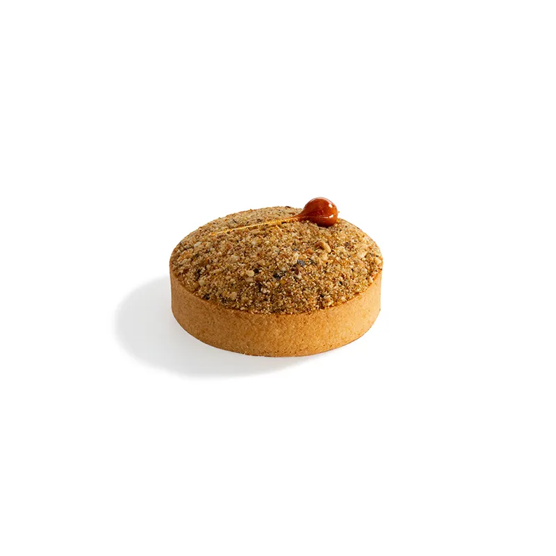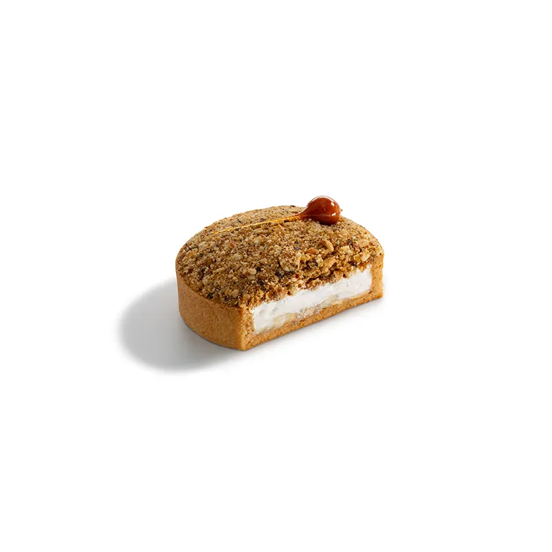 نان تارت شیرین و ترد که با لایه ای از میوه موز تازه داخل آن پر میشود و روی آن با کرم موز، فندق و بادام کاراملایز شده پوشانده و در انتها با فندق کاراملی تزئین میشود.قطر حدودأ 9 سانتی متر- مناسب برای یک نفر