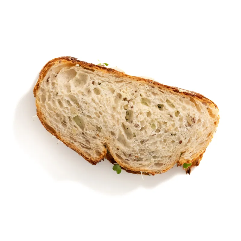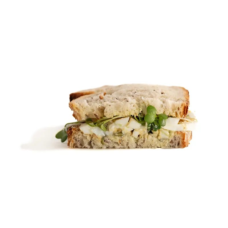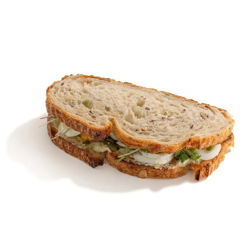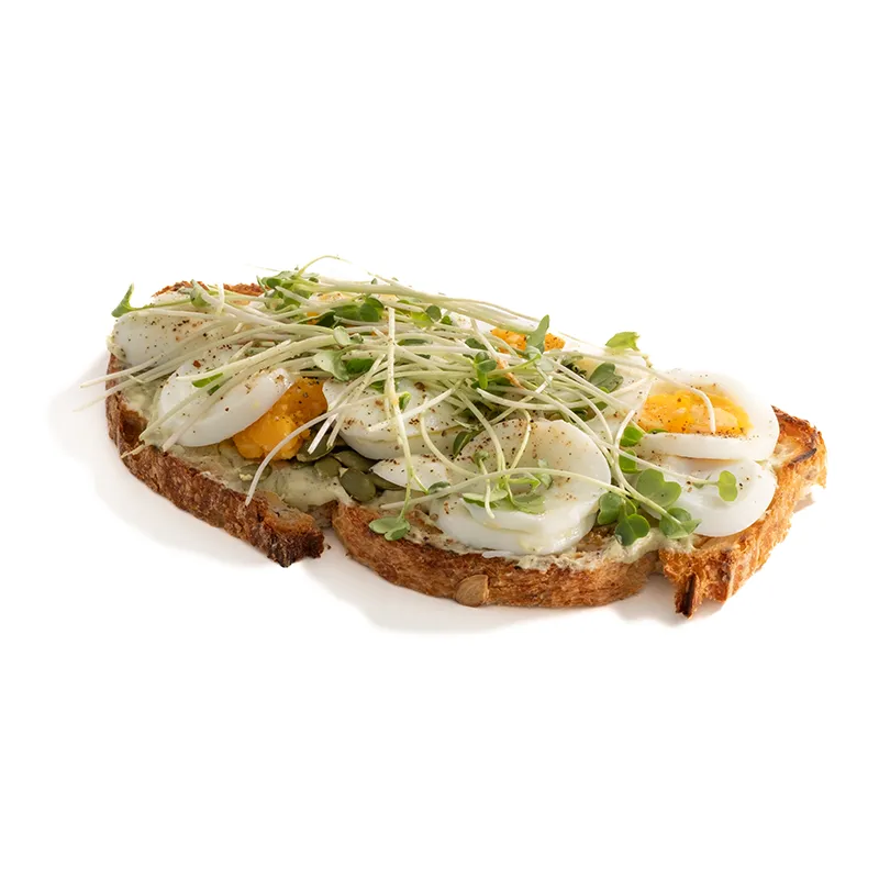 مناسب برای یک نفر، متشکل از: نان لوف مولتی گرین، تخم مرغ، سس آووکادو و ماست، میکرو گرین ترب، تخم کدو حلوایی