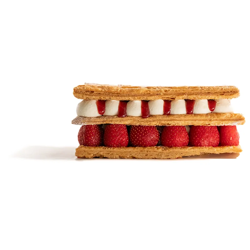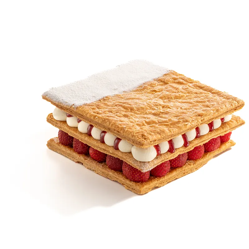 مناسب برای 5 تا 6 نفر. سه لایه خمیر فویته ی تهیه شده با کره که بین آن با کرم پتیسیر میلفوی و کولی توت فرنگی و توت فرنگی تازه پر شده و با پودر قند تزئین میشود.